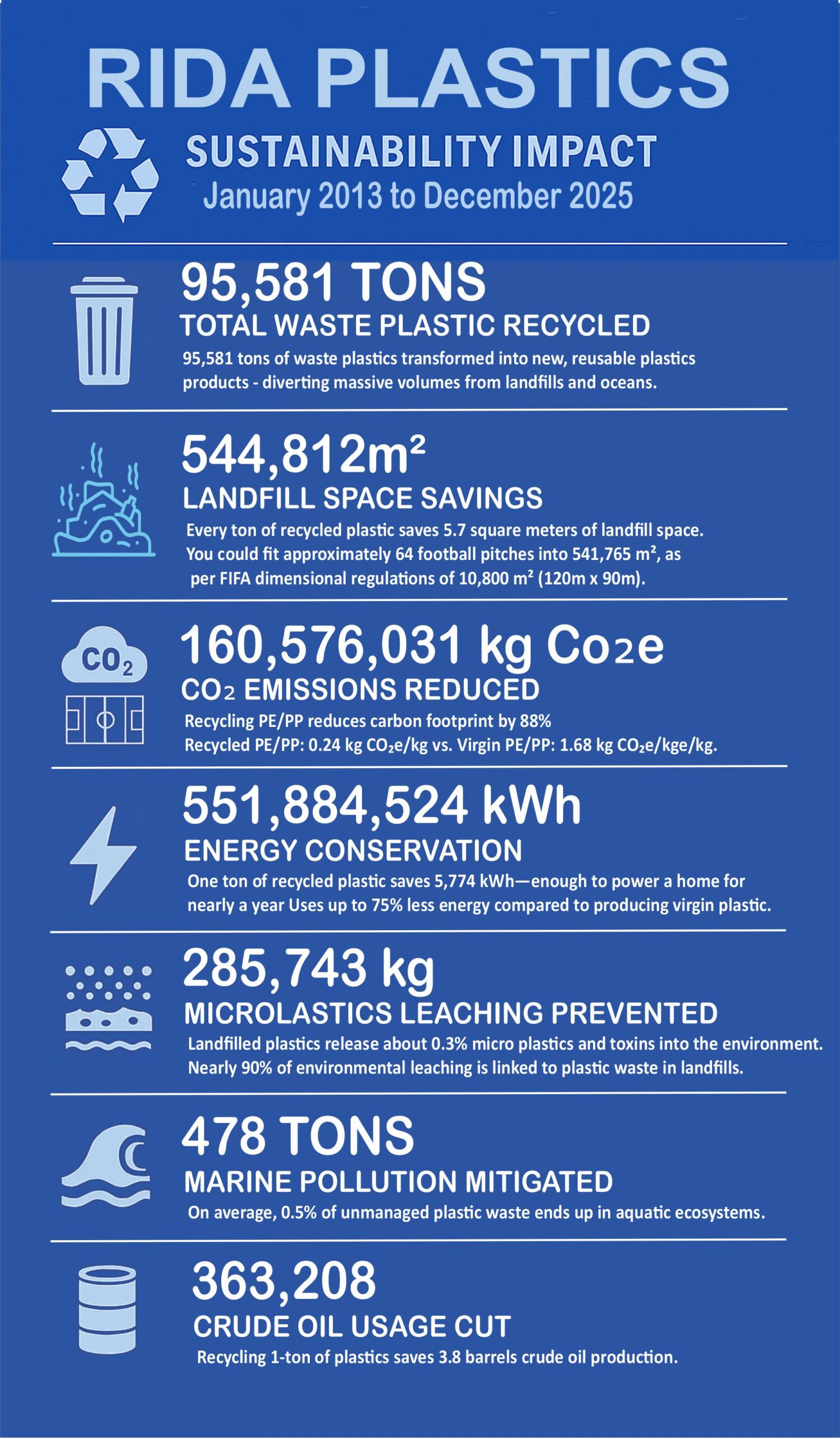 Every ton of recycled plastic saves 5.7 square meters of landfill space. You could fit approximately 64 football pitches into 544.812 m², as per FIFA dimensional regulations of 10,800 m² (120m x 90m).
